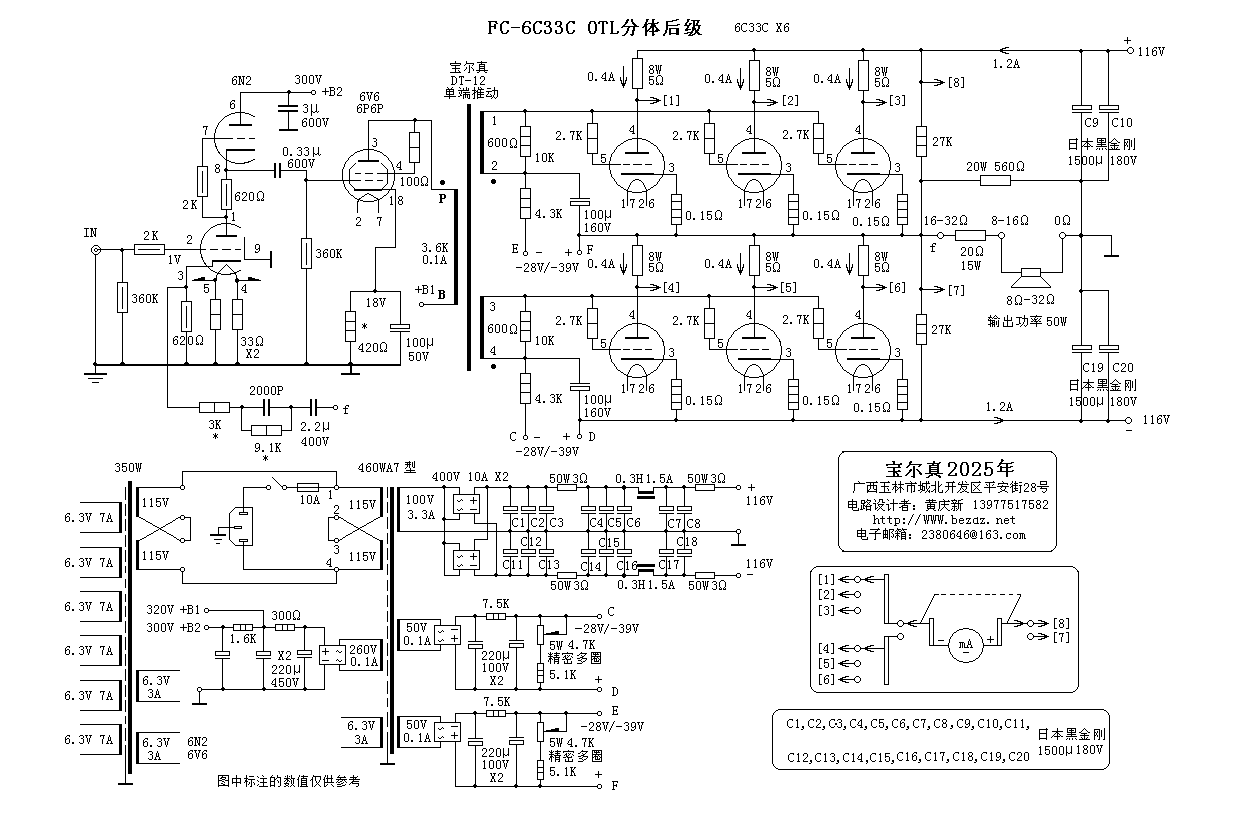 2只180WA7电源牛并联供电.灯丝采用交流供电.8欧输出端,2A3C管噪声电压小于2毫伏,300B管噪声电压小于5毫伏,音色甜美温醇,音场的动态感和力度感都有出色的表现.