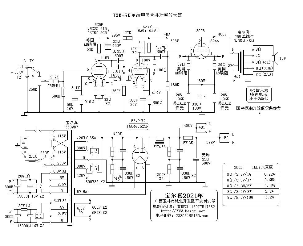 灯丝采用交流供电.8欧输出端,2A3B管噪声电压小于2毫伏,300B管噪声电压小于5毫伏.