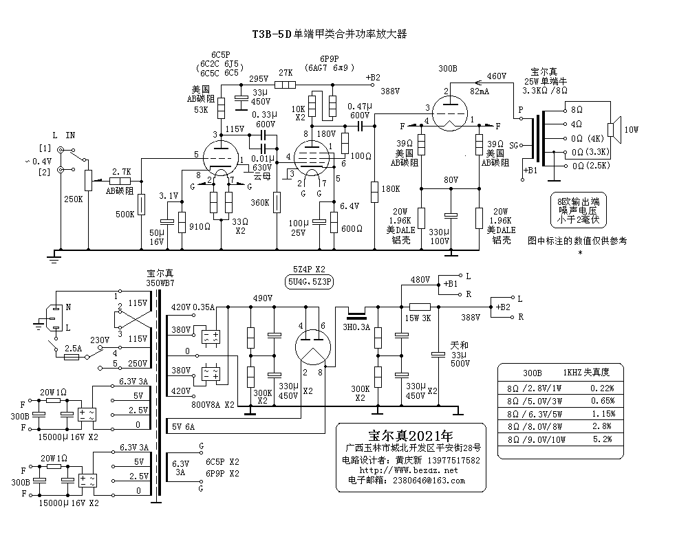 灯丝采用交流供电.8欧输出端,2A3B管噪声电压小于2毫伏,300B管噪声电压小于5毫伏.